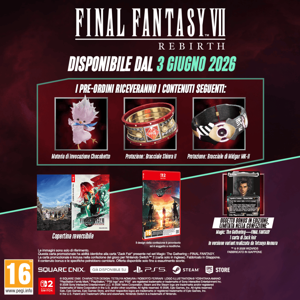 Oggetto bonus in edizione limitata nella confezione: 1 carta di Magic: The Gathering – FINAL FANTASY di ZaCk Fair in versione variant realizzata da Tetsuya Nomura!La carta promozionale è inclusa nella confezione del gioco per Nintendo Switch 2 (carta solo in inglese). Prodotta in Giappone. Offerta disponibile solo fino a esaurimento scorte.